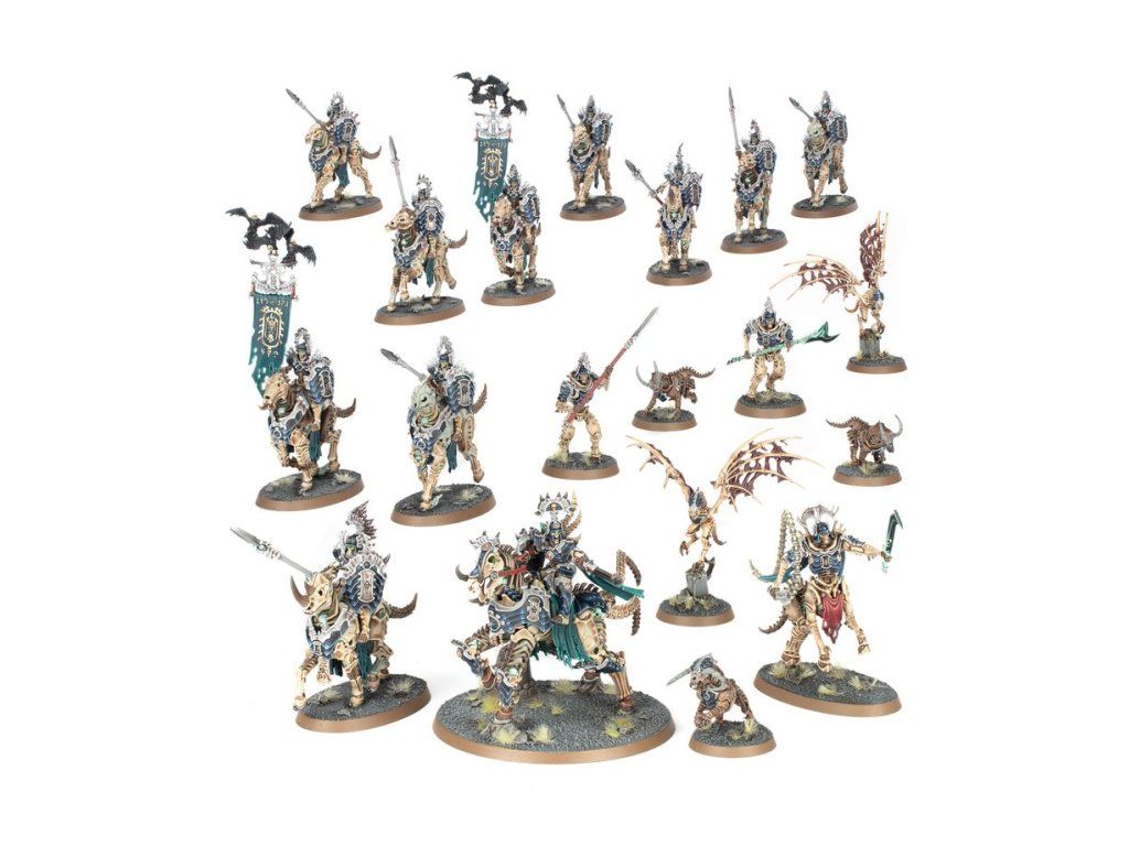 Nagash demands your loyalty. This box is an ideal way to start a new Ossiarch Bonereapers collection – or expand an existing army – and save money compared to buying the kits individually. The fast-moving force is led by a Liege-Kavalos, a harsh commander riding a Kavalos steed. Kavalos Deathriders make up the bulk of the force, riding down their foes and securing distant objectives. A Teratic Cohort bulks out the army, ready to hold vital objectives. These miniatures comprise a complete Spearhead force, meaning you're ready to jump into tight, tactical games and secure victory in the name of Nagash.