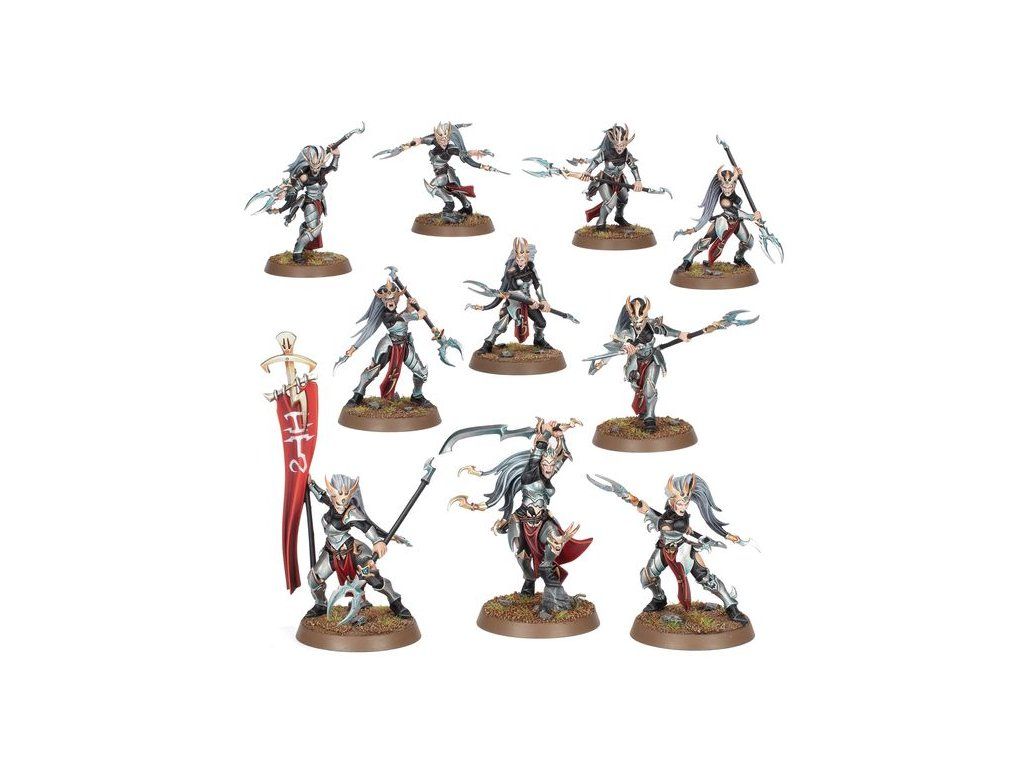 Blood Hags are the fighting elite of the Khainite aelves. Clad in gleaming armour and wielding twin-pronged valthrai polearms, they march into battle beside the war-shrines and warlords of the cult, messily executing any foes who dare come too close.