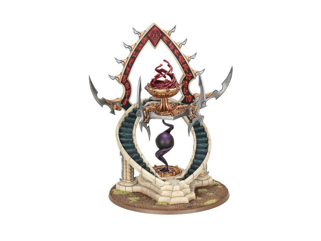 This multipart plastic kit builds a Shrine of Dark Tribute, a faction terrain piece for your Daughters of Khaine armies in games of Warhammer Age of Sigmar. Call forth the dark blessings of Khaine in the heat of battle and make your army even more murderous. The cruel-looking bladed structure features a pool of swirling blood over a ball of mysterious energy, making it a characterful painting project and fitting centrepiece for your collection. There is a choice of icon – representing either Morathi-Khaine or Morai-Heg – for the top of the structure, and the swirling blood in the altar's basin can be replaced with trailing smoke.