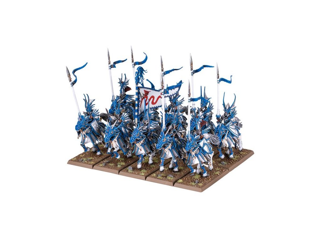 This multipart plastic kit builds ten Dragon Princes of Caledor, elite cavalry for use in High Elf Realms armies in games of Warhammer: The Old World. These heavy cavalry are ideal for breaking the back of enemy units with their nigh-unstoppable charges.