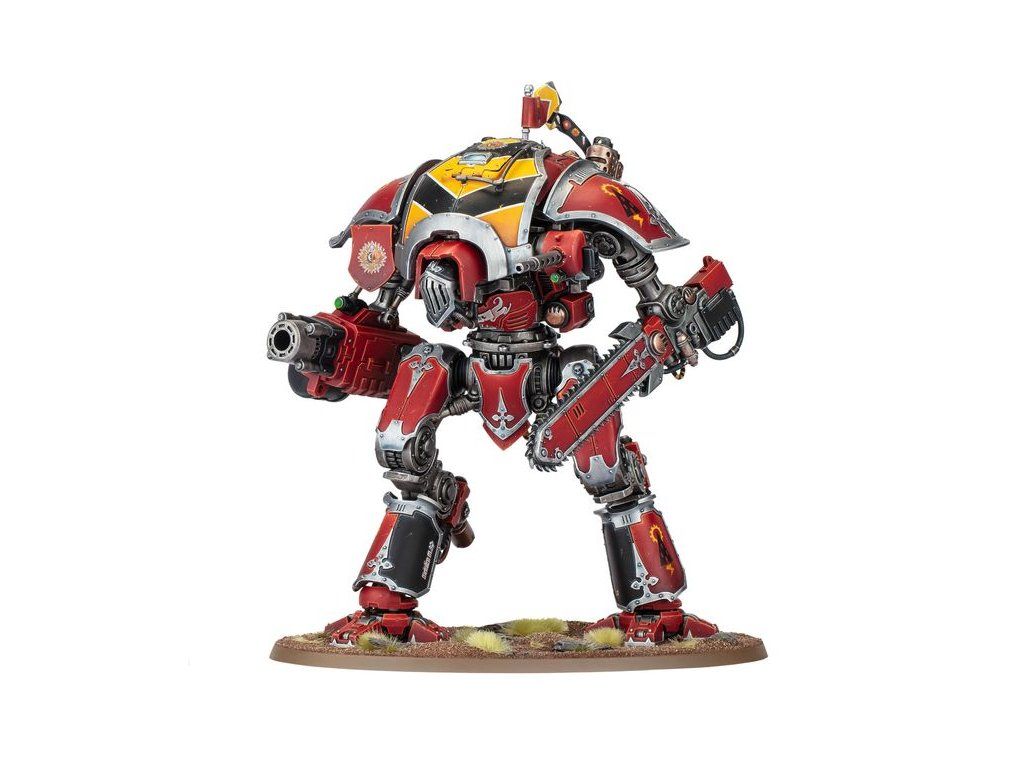 The Knight Destrier is agile and fleet-footed. Employing rocket thrusters, skilled pilots are able to lend greater speed to their charge, tearing into the foe with thundershock spears or reaper chainswords before mowing down what remains of their enemies with hails of chastiser gatling rounds or explosive munitions from their frag bombards.