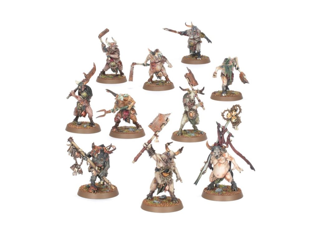 This multipart plastic kit builds 10 Pestigors, diseased beastmen for your Maggotkin of Nurgle armies in games of Warhammer Age of Sigmar. These bloated, rotting creatures are ready to march at the forefront of your army, shrugging off blows and getting to grips with their enemies so they can wreak havoc with their corroded weapons. The kit includes parts to build an optional champion, standard bearer, and musician, offering a degree of customisation to your unit.