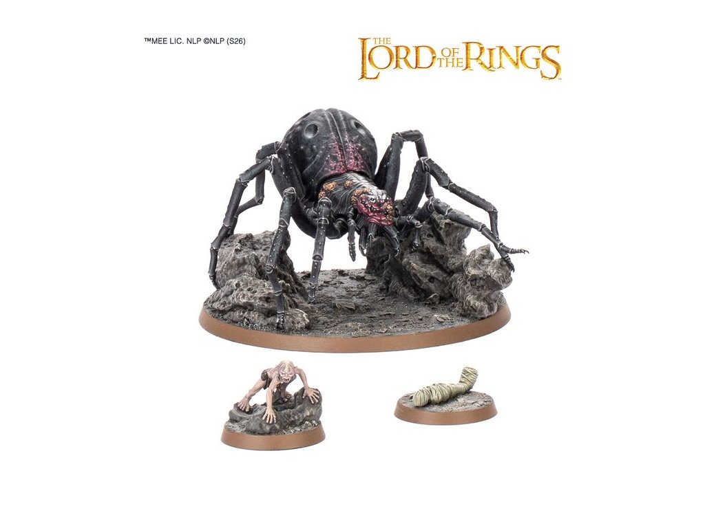 This multipart plastic kit builds Gollum, a twisted fighter for your Garrison of Ithilien armies, Shelob, a mighty spider for your Army of the Great Eye and Cirith Ungol armies, and an envenomed Frodo for use in the Middle-earth Strategy Battle Game. The hulking Shelob is a terrifying foe, and a treat for painters and collectors, covered with details that show her age, along with scenic base elements. Gollum shares a similarly rocky scenic base, over which he can be seen creeping. The webbed Frodo miniature can be used as a marker for scenarios found in the Middle-earth Strategy Battle Game Journal: The Treachery of Gollum supplement, which is available separately.