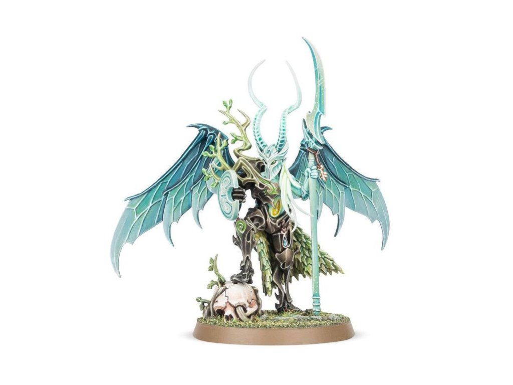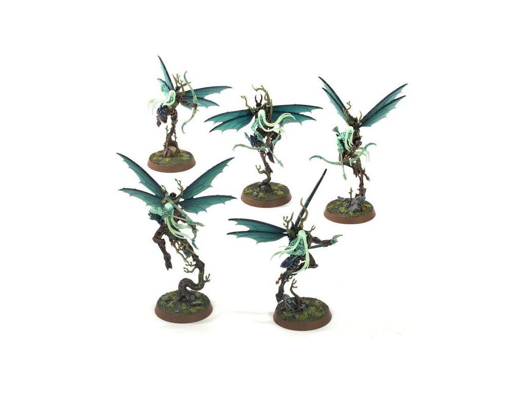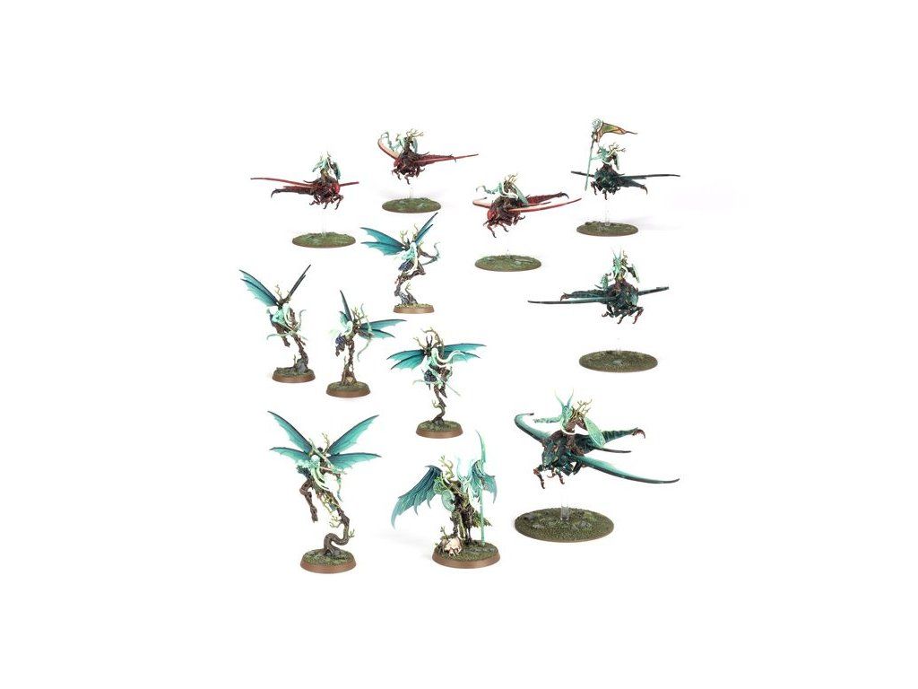 A Spitewing Flight is a fast-moving formation led by an Arch-Revenant, a winged forest spirit whose battle experience encompasses many long seasons. Gossamid Archers open hostilities with a rain of living arrows that eat through flesh, while Spiterider Lancers charge forth to slay their targets with magical spears and the ripping mandibles of their beloved dragonspite mounts. Finally, Revenant Seekers swoop down in the wake of the initial strike, scattering the survivors and reaping lives with each deft strike from their gleaming sickles.