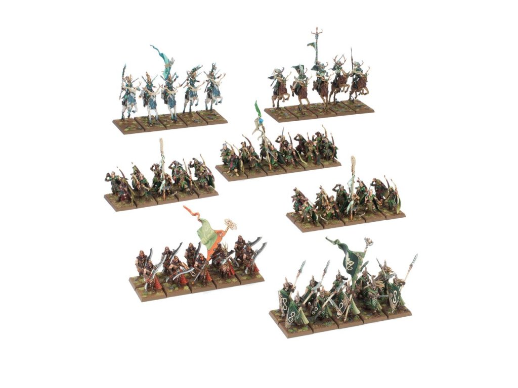 This boxed set builds a solid core of a Wood Elf Realms army for use in games of Warhammer: The Old World. Wild Riders and Sisters of the Thorn – elite cavalry – lead the charge, while specialist Wildwood Rangers and spear-wielding Eternal Guard act as shock troops. A sizable unit of Glade Guard wielding Asrai longbows supports the rest of the army.